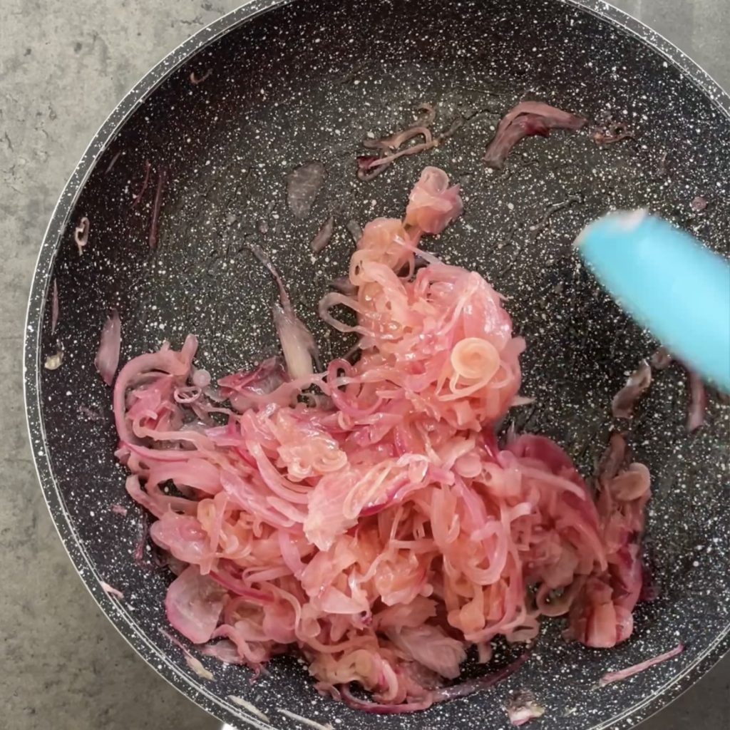 und das Wasser, setzen Sie die Pfanne auf das Feuer und lassen Sie die Zwiebeln kochen, bis sie weich werden.