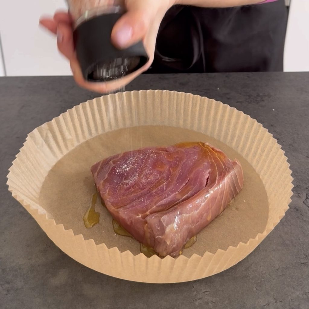 Beginnen wir mit der Zubereitung des Thunfischs in der Luftfritteuse, legen Sie das Thunfischstück auf das Blech und fügen Sie einen Schuss extra natives Olivenöl hinzu