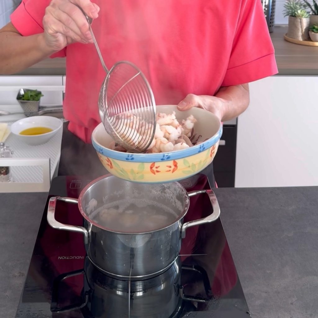 Sobald die Garnelen gekocht sind, abgießen und in die Schüssel mit den Tintenfischen geben,