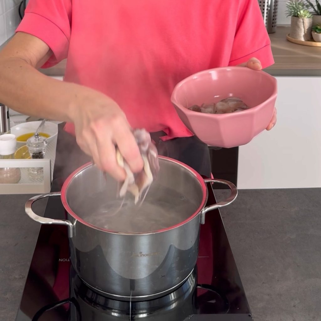 Reinigen Sie auch die Garnelen, indem Sie den Panzer entfernen, den Rücken einschneiden und mit einem Zahnstocher den dunklen Faden entfernen und unter fließendem Wasser waschen. Geben Sie sie dann in kochendes Wasser und lassen Sie sie 2-4 Minuten kochen.