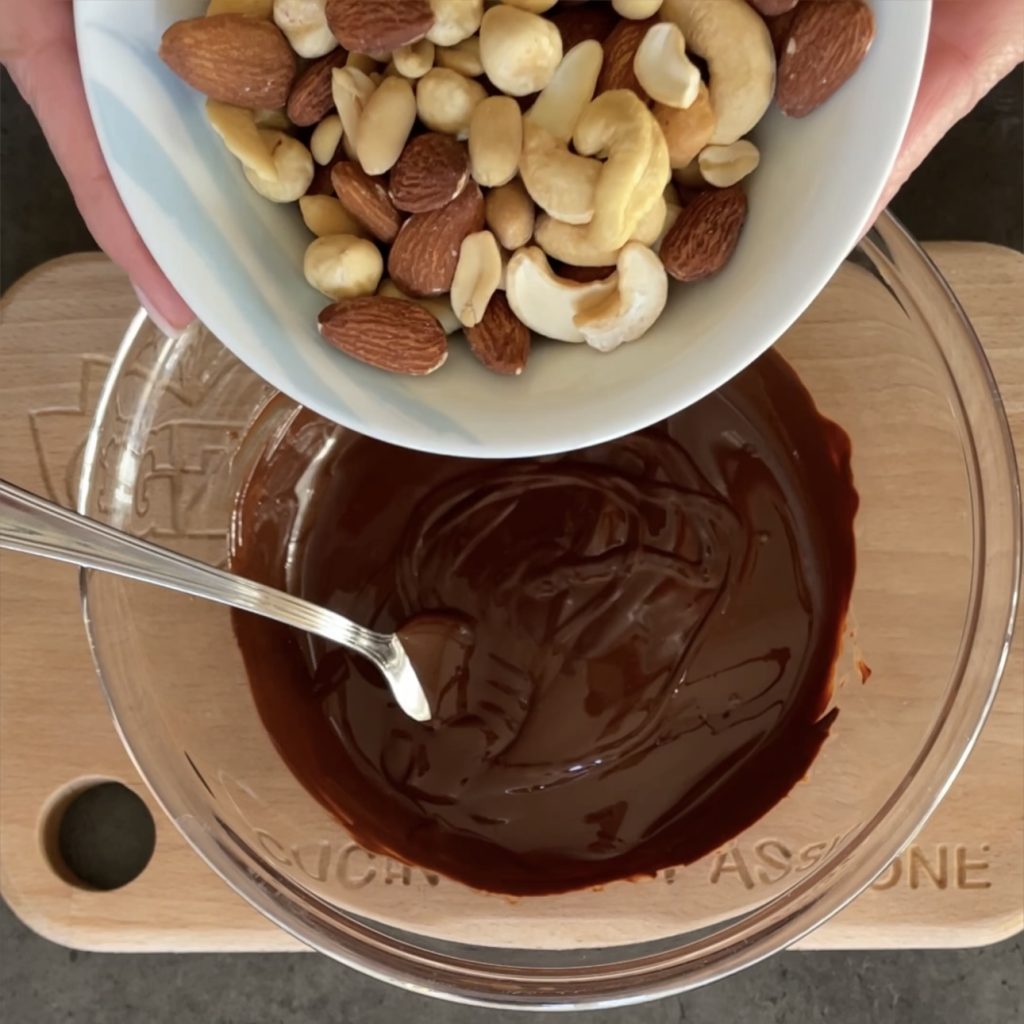 • und gut umrühren, damit sie schön mit der geschmolzenen Schokolade vermengt werden.