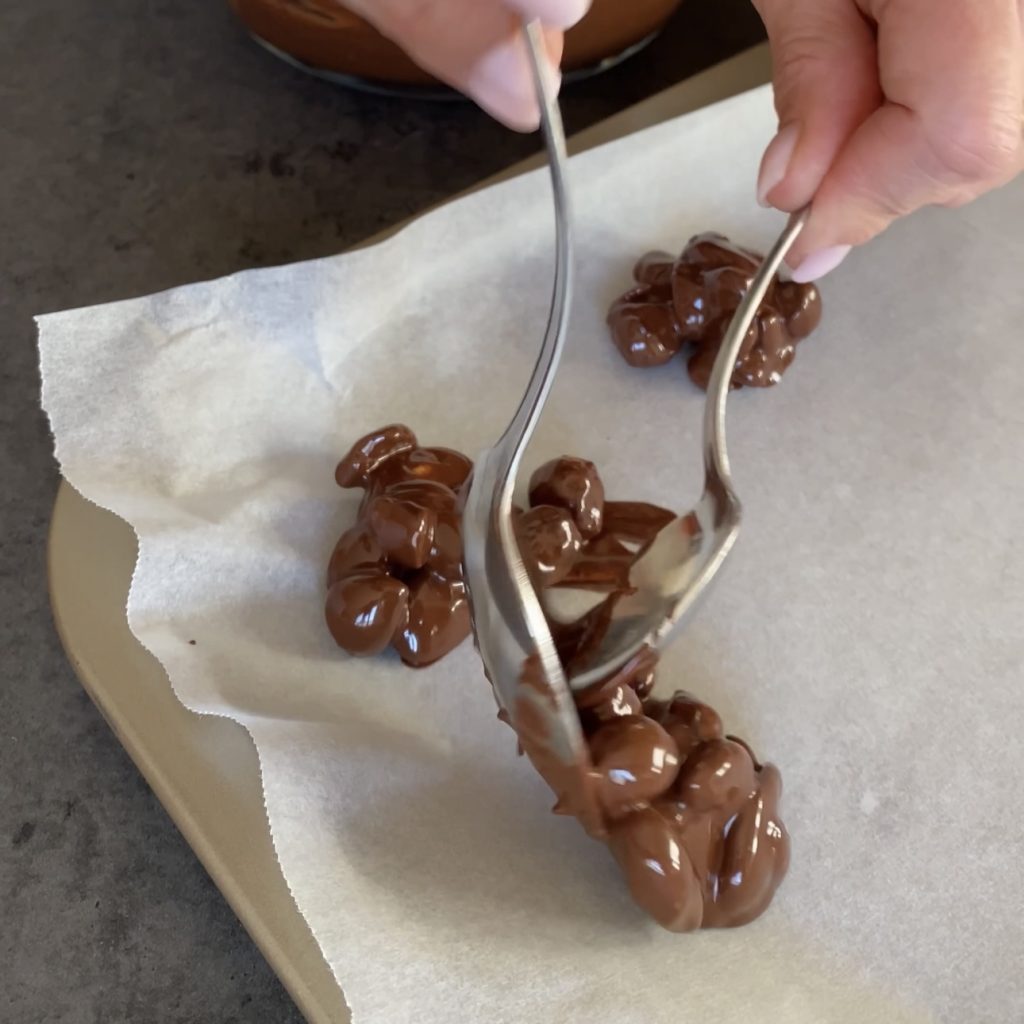 • Wenn Sie alle Häufchen von Trockenfrüchten mit Schokolade gemacht haben, mit Pistazienkrokant bestreuen.