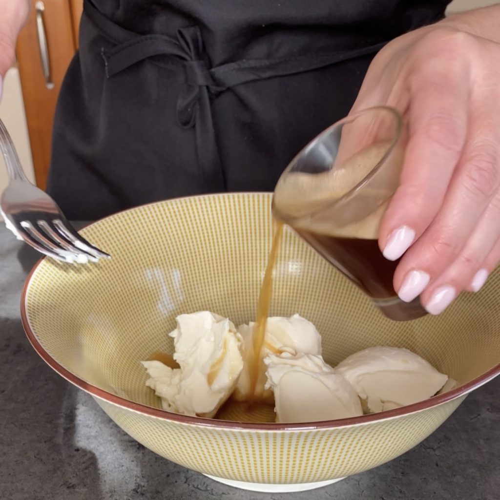geben Sie den Mascarpone in eine Schüssel und fügen Sie nach und nach Teile des kalten Kaffees hinzu,
