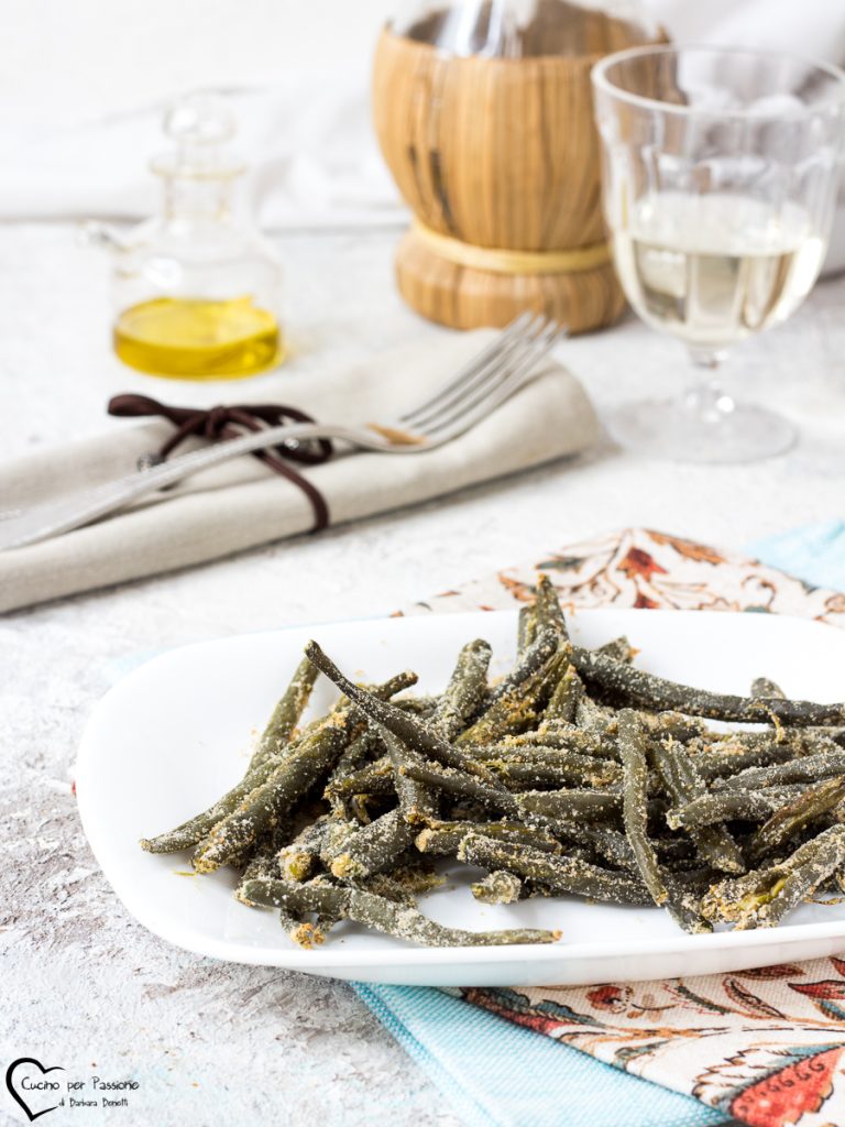 Sobald die grünen Bohnen gekocht sind, abtropfen lassen und abkühlen lassen. Geben Sie das Paniermehl und den geriebenen Käse in einen Teller, mischen Sie und geben Sie die grünen Bohnen dazu, gut mischen, damit die Bohnen das Paniermehl aufnehmen.