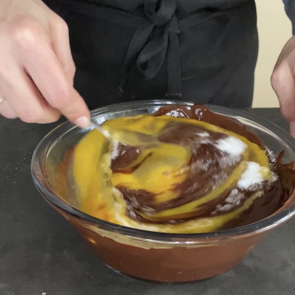 mischen Sie gut, damit die Butter schmilzt und sich mit der Schokolade verbindet.