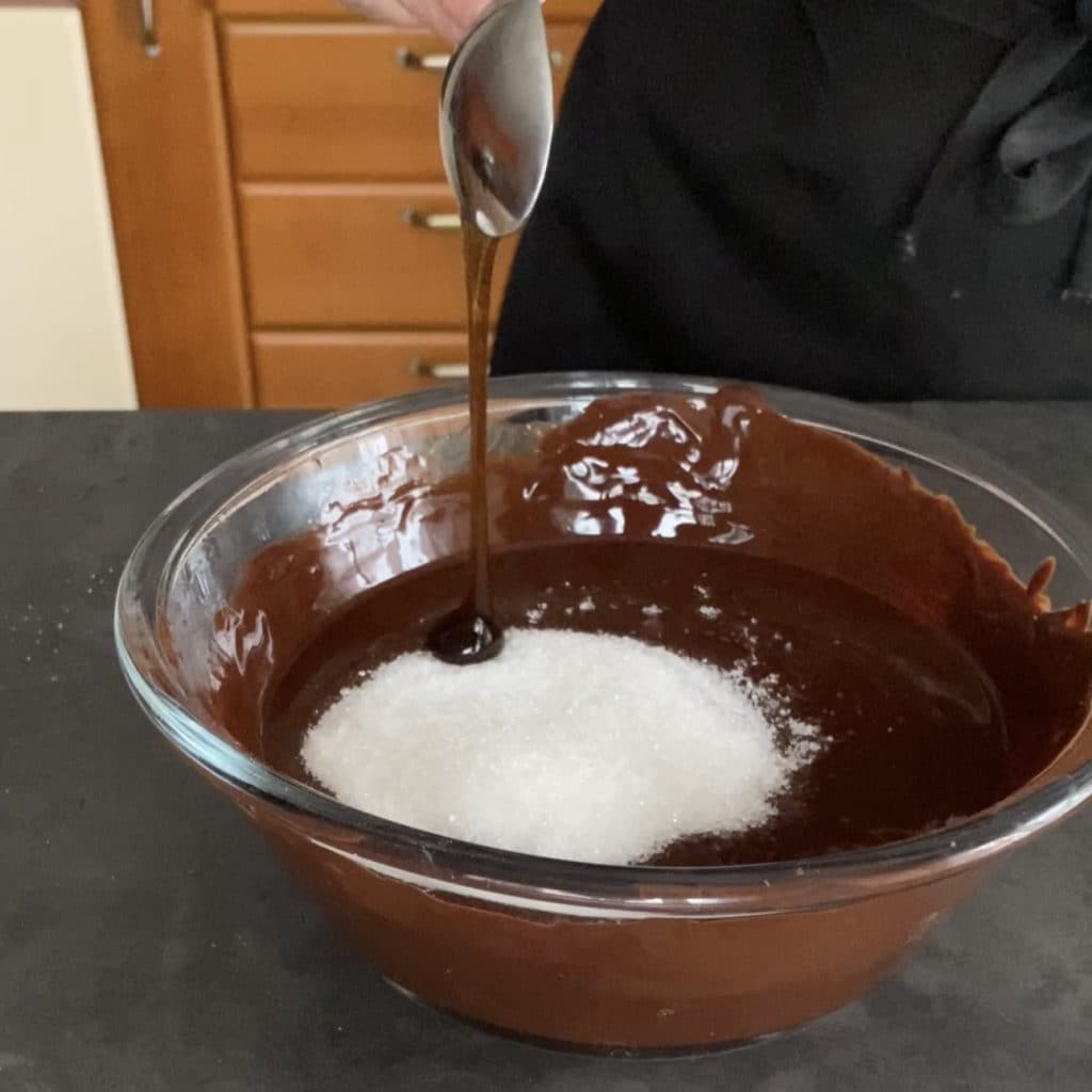 Wenn die Butter gut mit der Schokolade verbunden ist, fügen Sie den Zucker hinzu,