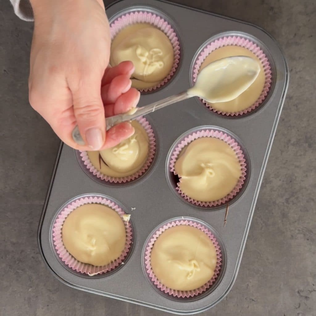 • Setzen Sie die Papierförmchen auf das Muffinblech, gießen Sie eine erste Schicht geschmolzener weißer Schokolade in jedes Förmchen.