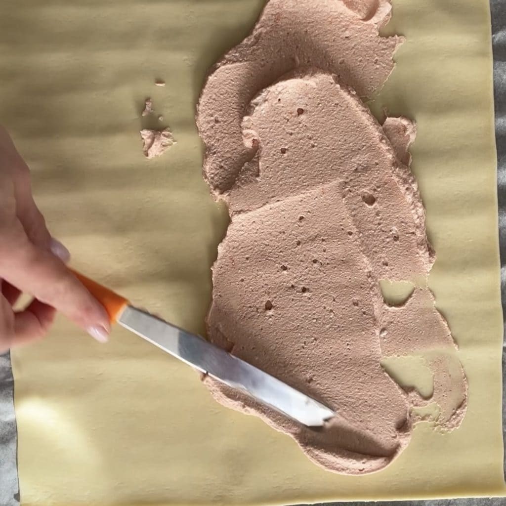 Lassen Sie die Rolle 30 Minuten im Kühlschrank ruhen, dann nehmen Sie sie heraus und schneiden Sie die Rolle in der Länge in zwei Hälften.