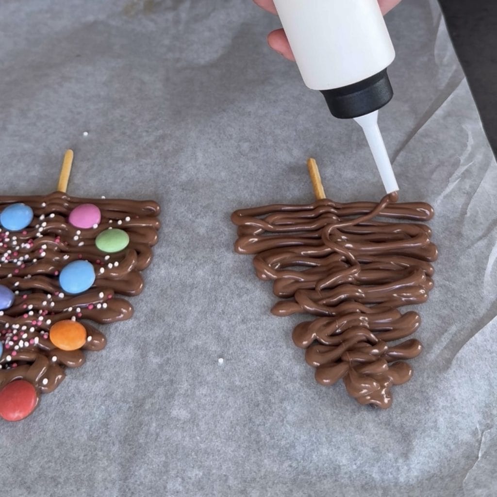 • Dekorieren Sie die Bäumchen immer, vorzugsweise mit einer Kugel an der Spitze jedes Baumes. Lassen Sie die Schokolade bei Raumtemperatur fest werden oder besser noch im Kühlschrank, damit es schneller geht und sie in wenigen Minuten fest wird.