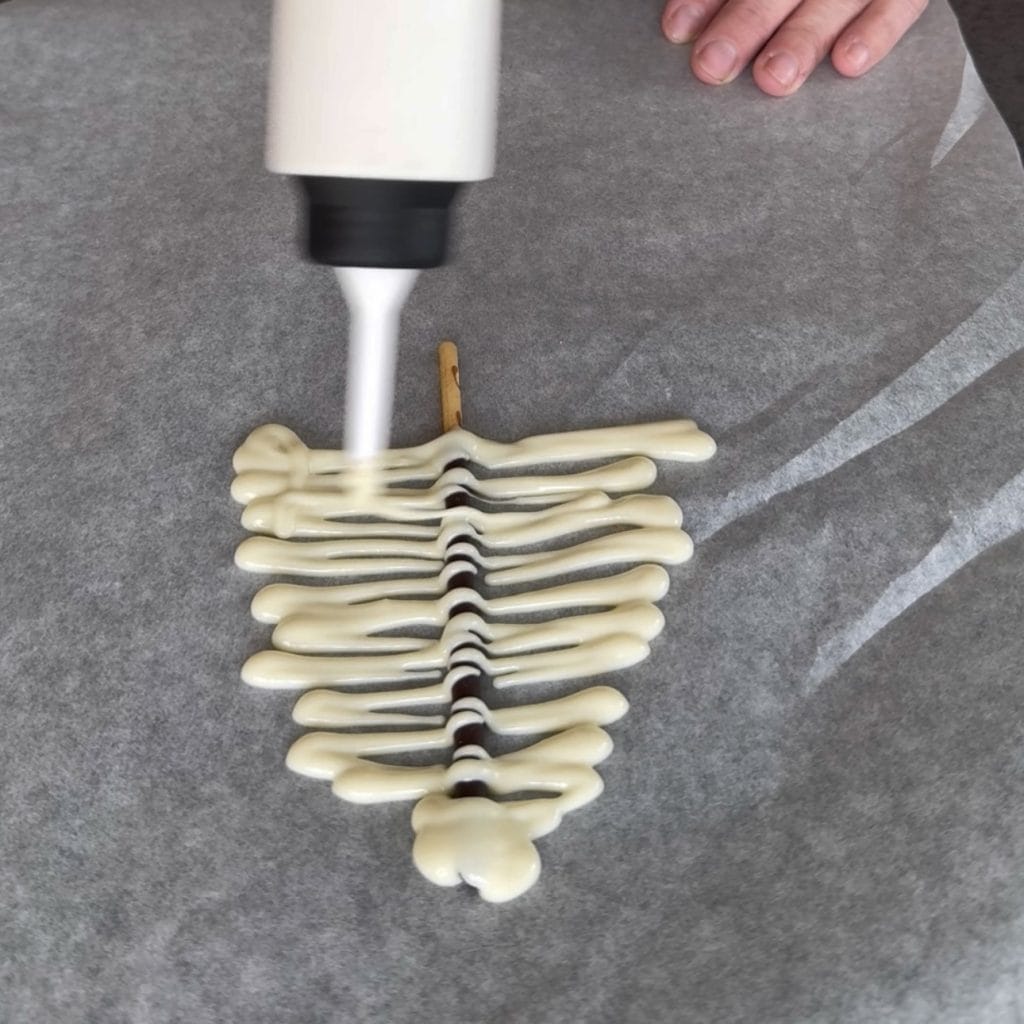 • Gießen Sie die Schokolade in die Spritze für Konditoren oder in einen Spritzbeutel, in den Sie eine dünne Tülle eingesetzt haben.