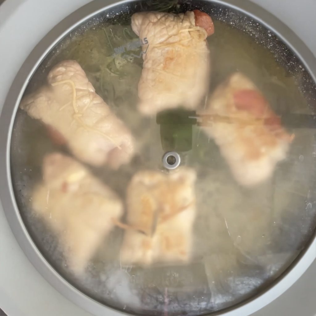 Gebt in eine große Pfanne extra natives Olivenöl und Zweige Rosmarin, lasst es ein paar Minuten ziehen, legt die Röllchen hinein und bratet sie gut an, indem ihr sie oft wendet.