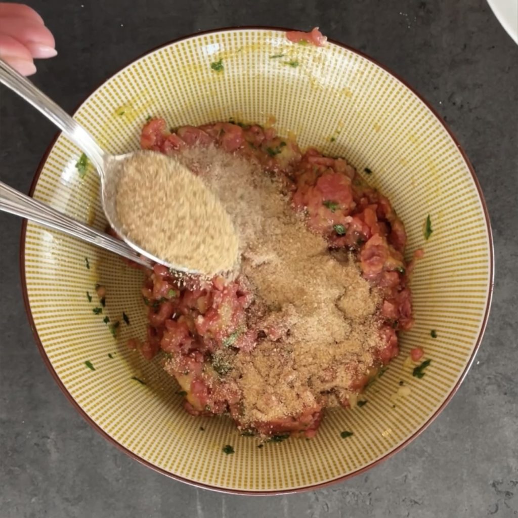 • und das Paniermehl dazu, gut mit einer Gabel mischen und dann mit den Händen weiterkneten, um eine schöne homogene und kompakte Masse zu erhalten.