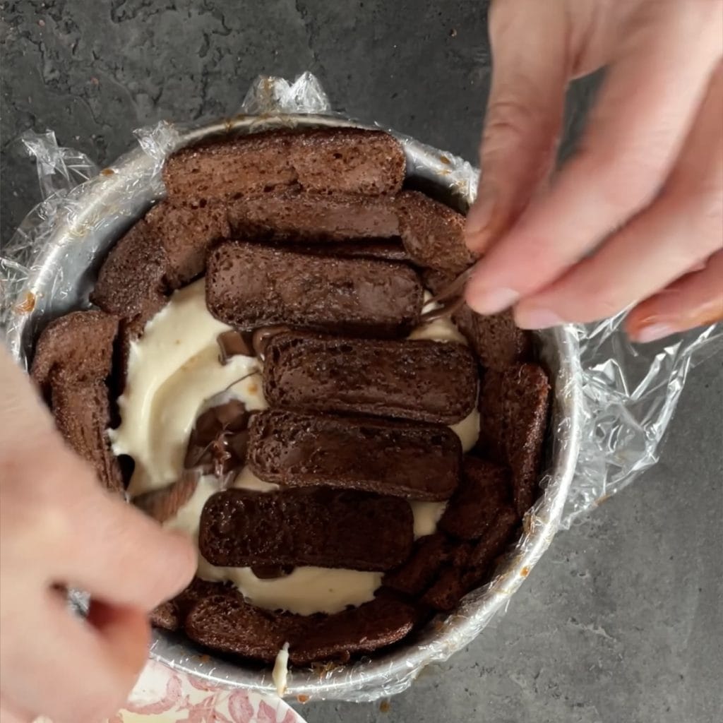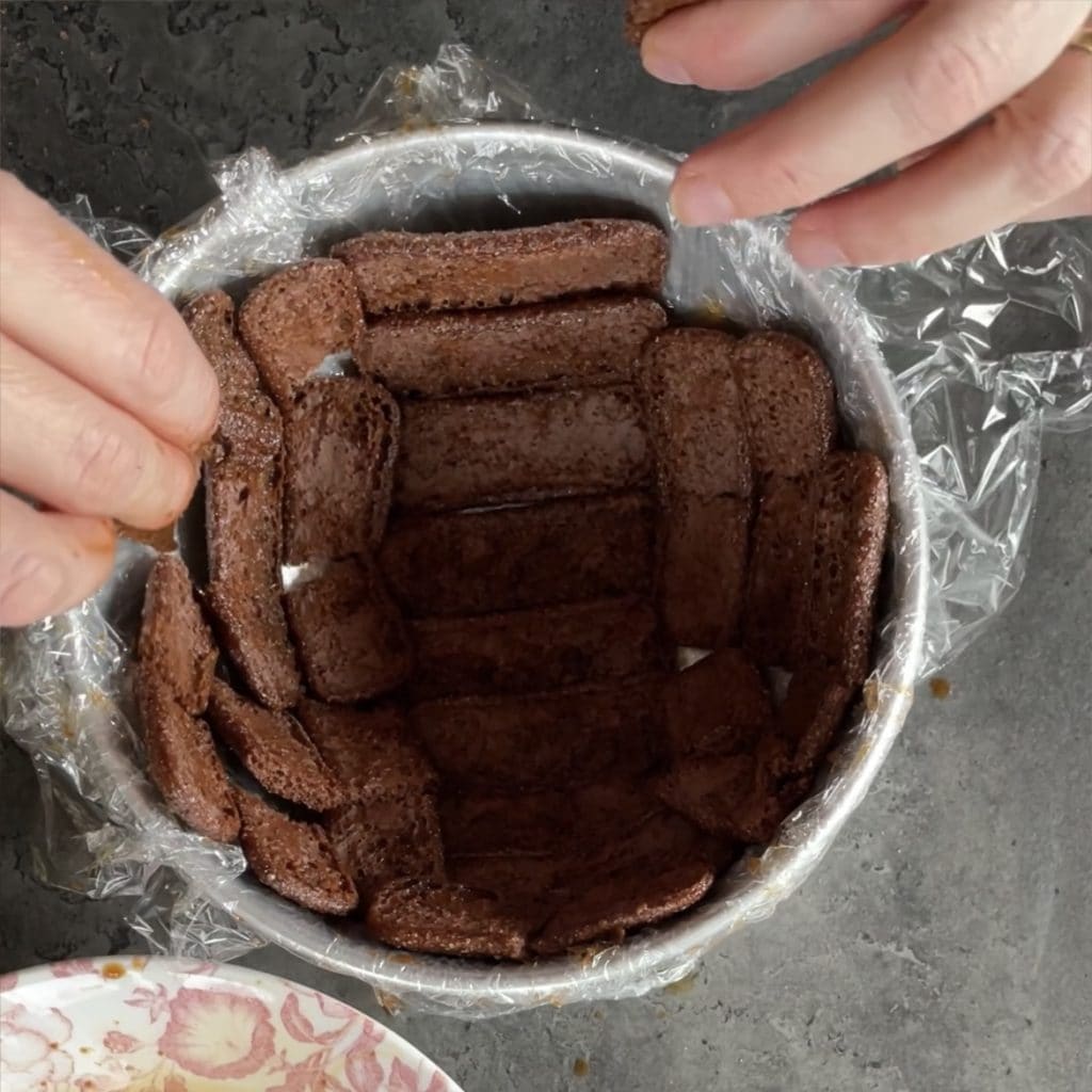 • kleiden Sie die Zuccotto-Form vollständig aus, bei Bedarf brechen Sie die Pavesini, um eventuelle Lücken zu schließen.
