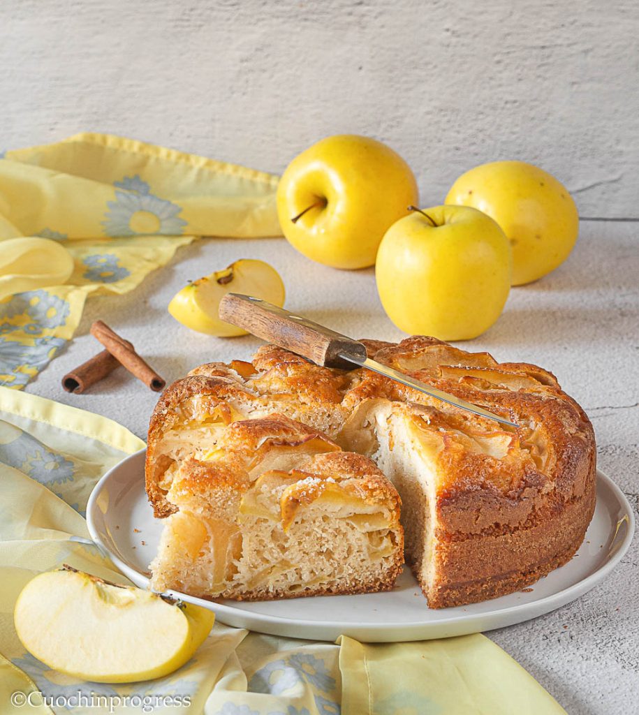 Vollständig ohne Butter im Teig zubereitet, ersetzt durch Pflanzenöl und Joghurt, ist er eine hervorragende Alternative zum klassischen Apfelkuchen. Das Ergebnis ist trotzdem ein eher leichter, aber sehr schmackhafter Kuchen, auch geeignet für eine kalorienreduzierte Ernährung.
