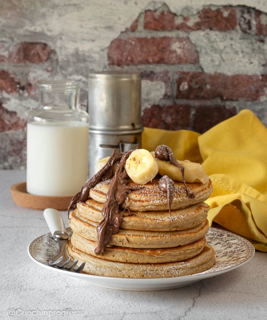 Bei mittlerer bis niedriger Hitze 1–2 Minuten pro Seite braten, bis Blasen auftauchen und sich die Unterseite leicht löst. Hilf mit einem Pfannenwender.Die Pancakes stapeln und heiß servieren, mit Toppings nach Wahl: Nutella, Honig, Ahornsirup, Joghurt, frisches Obst, Erdnussbutter oder geschmolzene Schokolade.