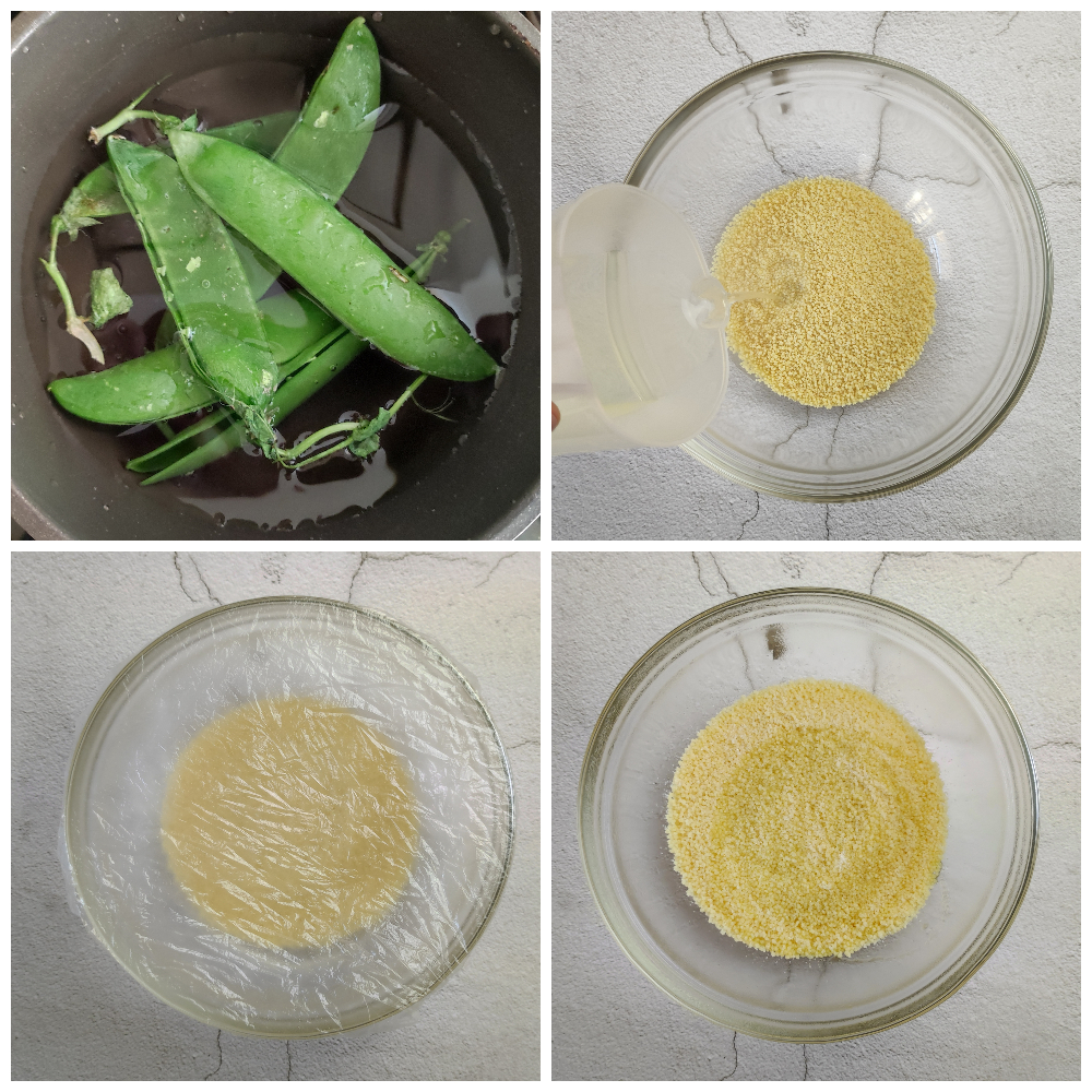Zuerst löst ihr die Erbsen und Saubohnen aus den Schoten. Gebt etwas Wasser in einen kleinen Topf, einige Erbsenschoten dazu und lasst es aufkochen. Dann ausschalten und etwas abkühlen lassen.