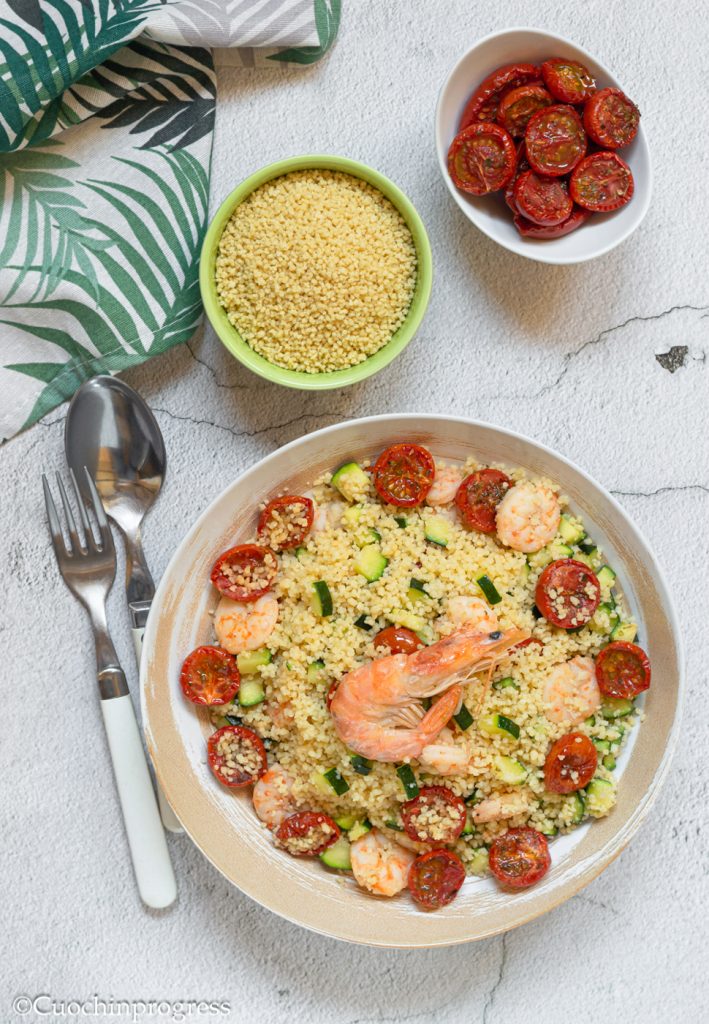 Der COUSCOUS MIT ZUCCHINI, MAZZANCOLLE UND KONFIERTEN KIRSCHTOMATEN ist ein frisches und appetitliches Erstgericht, reich an Geschmack und nützlichen Nährstoffen, das sich in der warmen Jahreszeit anbietet, wenn man leichte und heitere Gerichte bevorzugt. Er eignet sich als Hauptgericht und sogar als Alleinmahlzeit, eventuell ergänzt durch frisches Obst oder ein gefrorenes Dessert.