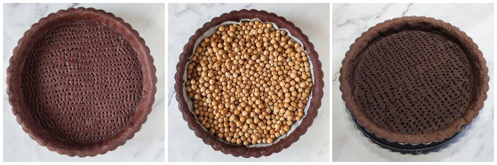 Bedecke ihn mit Backpapier und fülle ihn mit getrockneten Kichererbsen (oder Backgewichten).