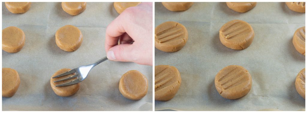 Drückt mit den Zinken einer Gabel leicht auf jeden Keks. Ihr könnt zwei gekreuzte Linien machen, das sieht besonders hübsch aus.