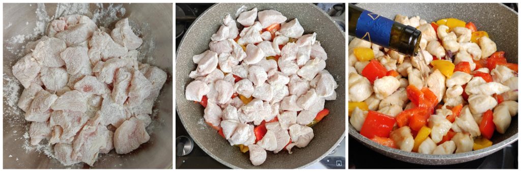 Wendet die Hähnchenstücke in Mehl, klopft überschüssiges Mehl ab und gebt sie in die Pfanne. Bei starker Hitze rundherum etwa 10 Minuten anbraten.