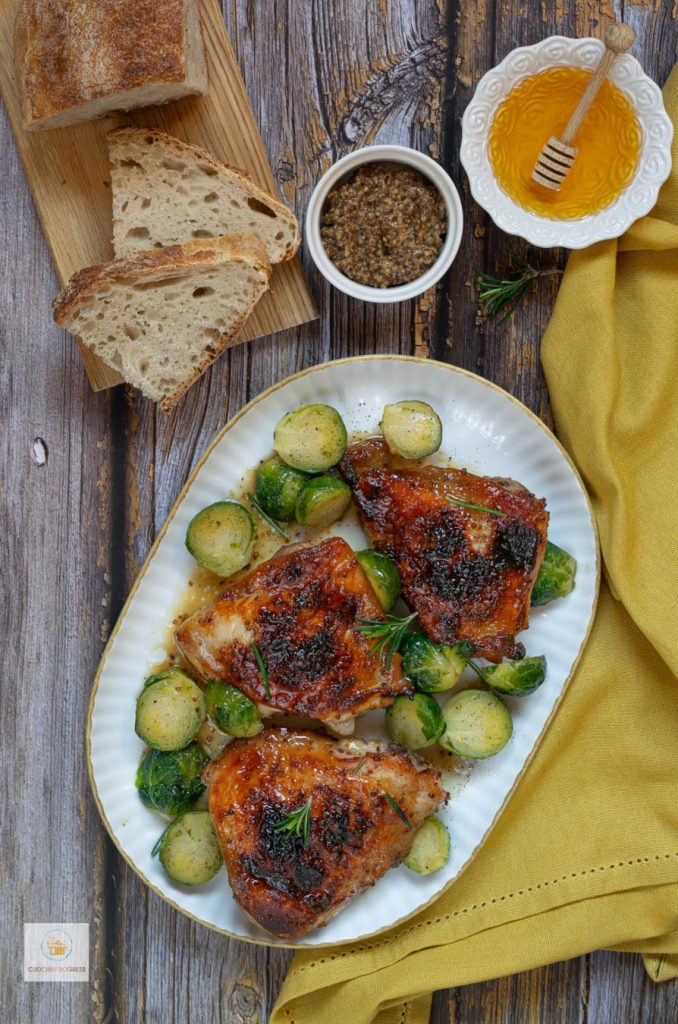 Servieren Sie die Hähnchenschenkel mit Honig und Senf mit Beilagen wie in der Pfanne gebratenem Rosenkohl, Ofenkartoffeln oder gegrilltem Gemüse.