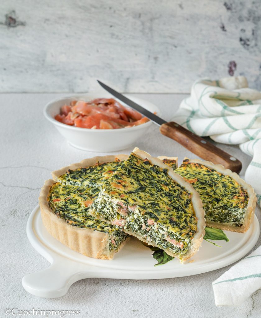 Die HERZHAFTE LACHS-SPINAT-TARTE ist ein reichhaltiges und verlockendes Gericht, das sich sowohl als Vorspeise zu einem Festessen als auch als Hauptgericht bei einem leichten, aber eleganten Mittagessen eignet. Die Zubereitung ist unkompliziert und besonders angenehm dank der perfekten Balance der Zutaten: die cremige Süße der Ricotta ergänzt den frischen, leicht bitteren Geschmack des Spinats, und der geräucherte Lachs verleiht Duft und einen würzigen Akzent.