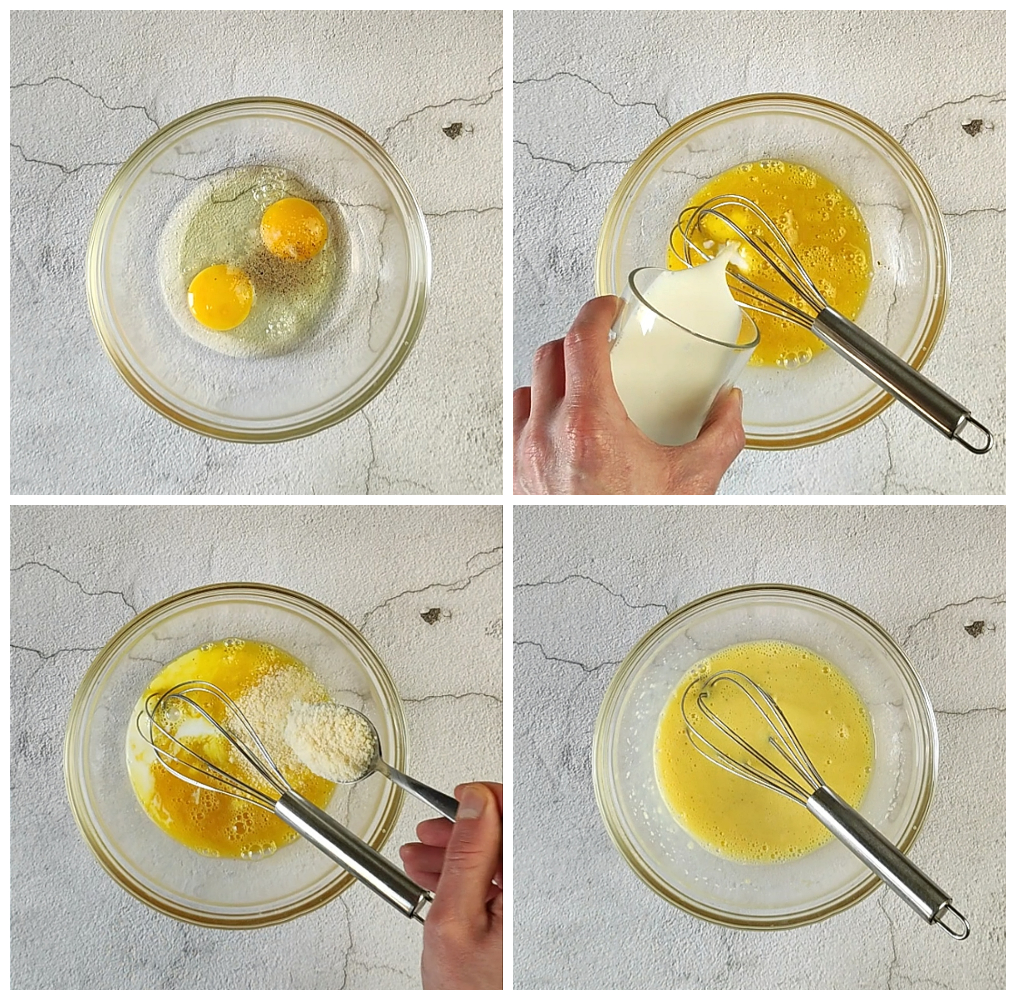 In einer Schüssel die Eier mit der Milch, dem Parmesan, Salz und Pfeffer verquirlen.