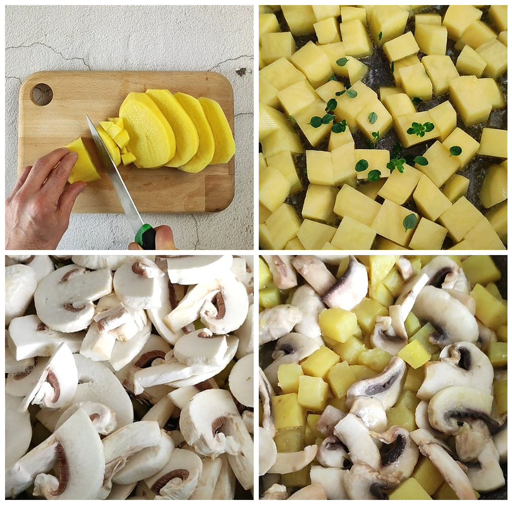 Nach den 10 Minuten die Pilze zu den Kartoffeln geben, nochmals salzen und weitere 5 Minuten weitergaren.