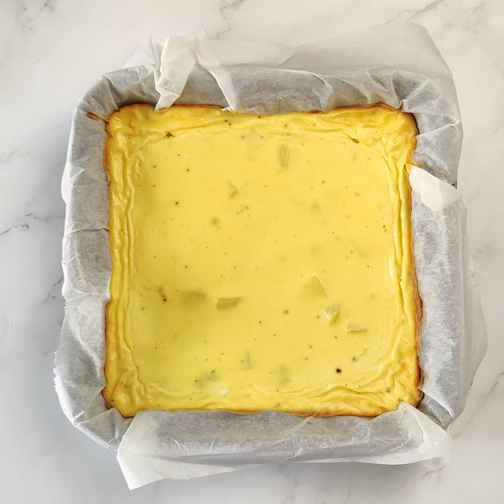 Alles gut vermischen und die Masse auf den Boden einer quadratischen Backform 20 x 20 cm legen, die mit Backpapier ausgelegt ist. Mit einem Löffel festdrücken, damit die Basis kompakt wird.Für 30 Minuten in den Kühlschrank stellen.