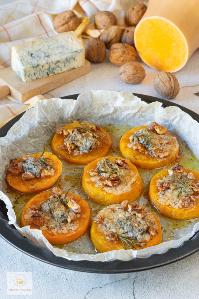 Zubereitung: Im Ofen gebackener Kürbis mit Gorgonzola und Walnüssen