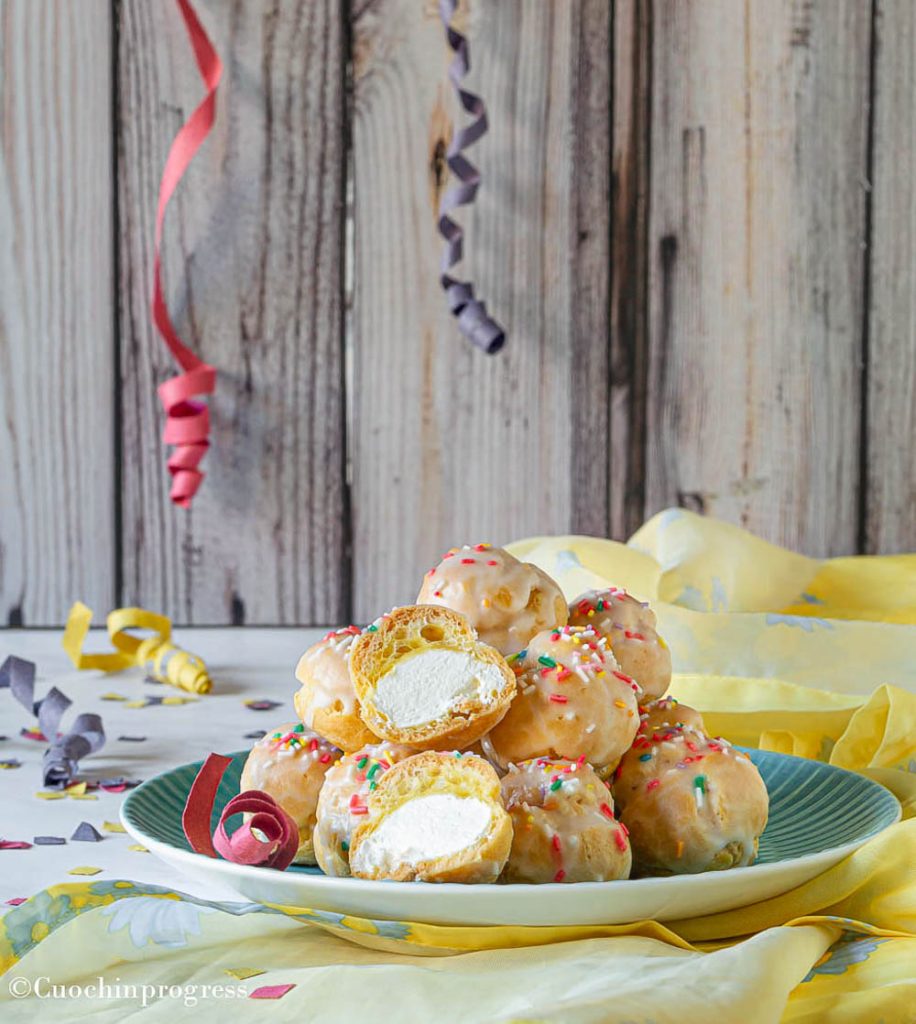 Die KARNEVALS-WINDBEUTEL sind kleine, superleckere Küchlein mit cremigem Kern, die man sowohl als Dessert nach dem Essen als auch bei einem fröhlichen Buffet an Festtagen – nicht nur für Kinder – servieren kann. Ihr Markenzeichen neben dem Geschmack ist ihr buntes Äußeres, das perfekt zum Karneval passt, aber auch zu Geburtstagen oder anderen fröhlichen Anlässen.