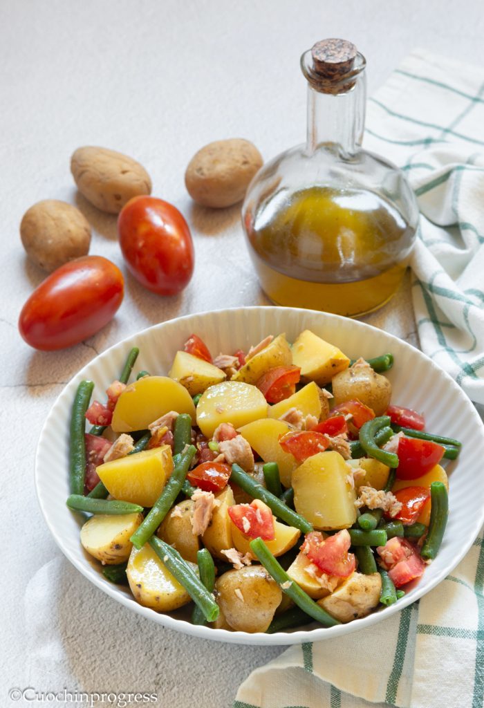 Es ist ein einfacher Salat, wie Sie sehen, aber gleichzeitig sehr ausgewogen und somit auch geeignet für alle, die auf ihre Figur achten möchten, ohne dabei die nötige Energie für einen aktiven Tag zu verlieren: die Kohlenhydrate der Kartoffel, die Proteine und das Vitamin C der Bohnen, zusammen mit den Mineralstoffen der Tomaten und den „guten“ Proteinen und Fetten des Thunfischs machen das Gericht wirklich ausgewogen. Außerdem, und das ist wichtig, harmonieren die Aromen wunderbar und der Salat wird zu einer echten Geschmackssymphonie für unseren Gaumen.