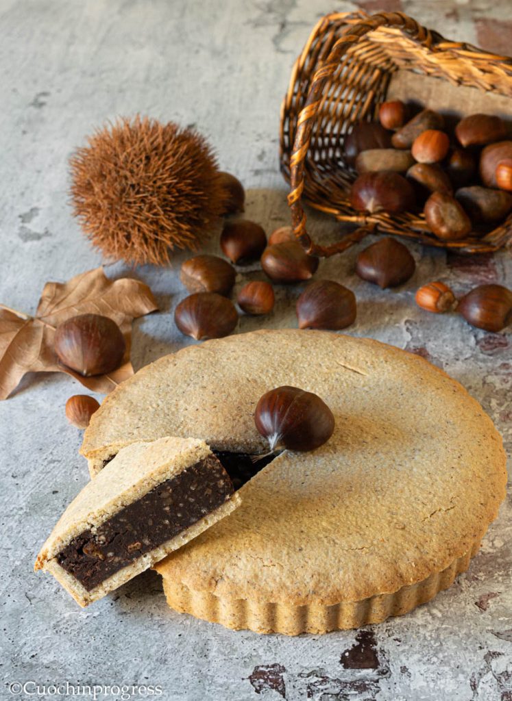 Die KASTANIEN-UND-ORANGEN-TARTE mit kandierten Orangen ist ein herbstliches Dessert mit einem reichhaltigen und umhüllenden Aroma. Der Boden besteht aus einem mürben Haselnuss-Mürbeteig, der perfekt ist, um die weiche und cremige Kastanienfüllung aufzunehmen.