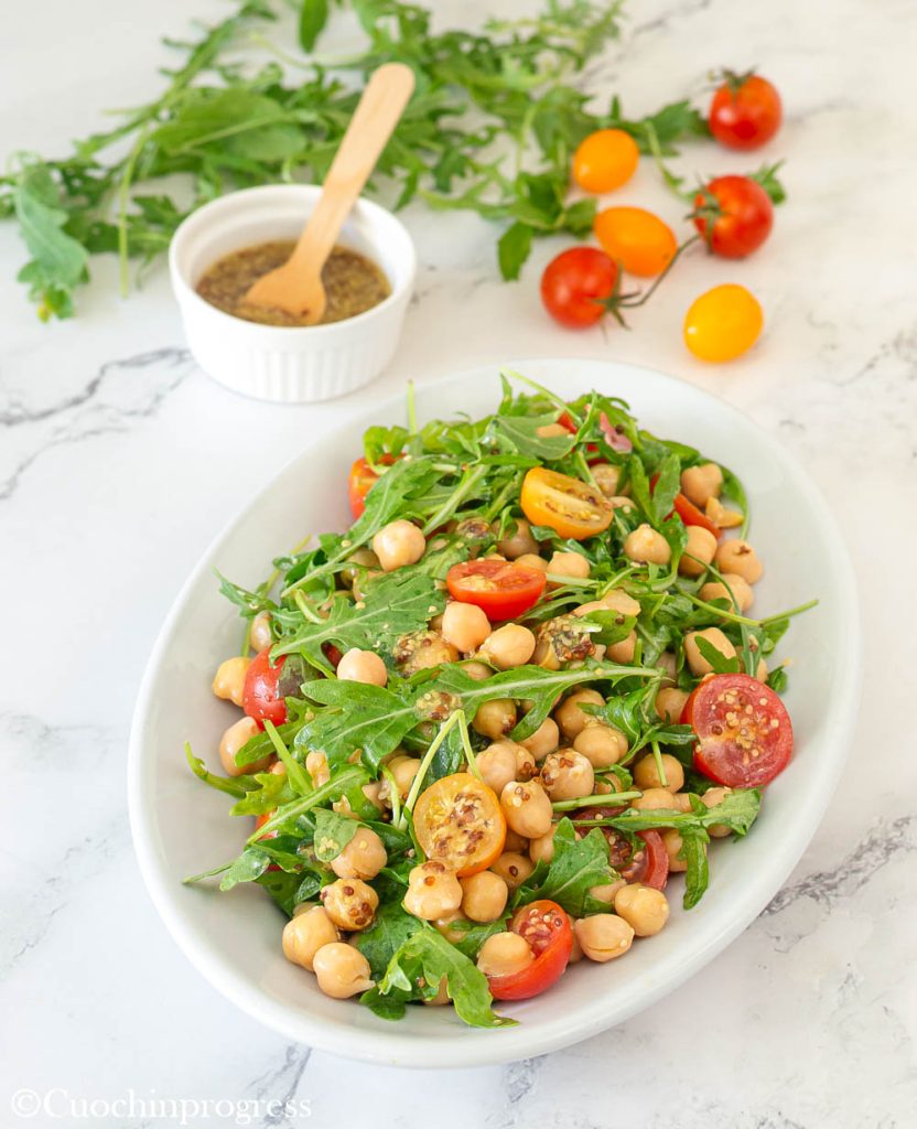 DER KICHERERBSEN-SALAT MIT RUCOLA UND KIRSCHTOMATEN ist ein sommerliches, schmackhaftes und gesundes Gericht, das durch die schnelle Zubereitung und die einfachen Zutaten überrascht. Wenn die Hitze kommt, hat man bekanntlich wenig Lust, am Herd zu stehen, und ein kaltes Gericht zuzubereiten ist genau das Richtige.
