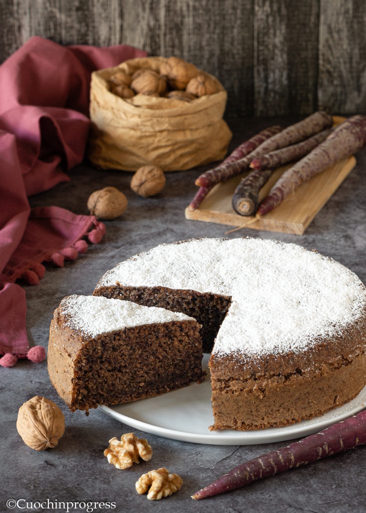 Der LILA-MÖHREN-WALNUSS-KUCHEN ist ein rustikaler, sehr saftiger und aromatischer Kuchen mit leicht feuchtem Inneren – einfach köstlich. Er eignet sich hervorragend zum Frühstück, als Nachmittags-Snack zu einer Tasse heißen Tees oder auch als Dessert nach dem Essen, begleitet z. B. von mit Zimt aromatisierter Schlagsahne oder einer süßen Frischkäse-Creme (um den Freunden aus Übersee zu ähneln).