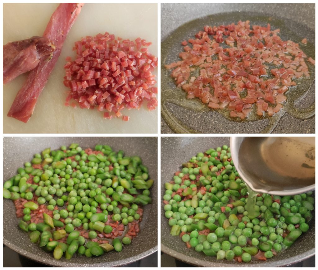 Reiben oder hacken Sie die Coppiette vom Schwein und geben Sie sie mit einem Schuss Öl in eine Pfanne. Lassen Sie sie bei schwacher Hitze etwa 20 Sekunden anrösten, dann fügen Sie Spargel und Erbsen hinzu.