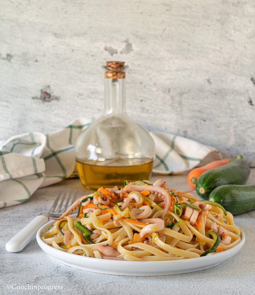 Die LINGUINE MIT TINTENFISCHEN, ZUCCHINI UND KAROTTEN sind ein schmackhaftes und fröhliches Erstgericht, einfach zuzubereiten und ideal, euren Gästen bei vielen Gelegenheiten zu servieren, wenn ihr einen guten Eindruck machen wollt, ohne euch anzustrengen oder viel auszugeben. Es ist ein Gericht, das sich besonders für die warme Jahreszeit eignet und den Geschmack des Meeres mit dem farbenfrohen, knackigen Gemüse vom Feld vereint.