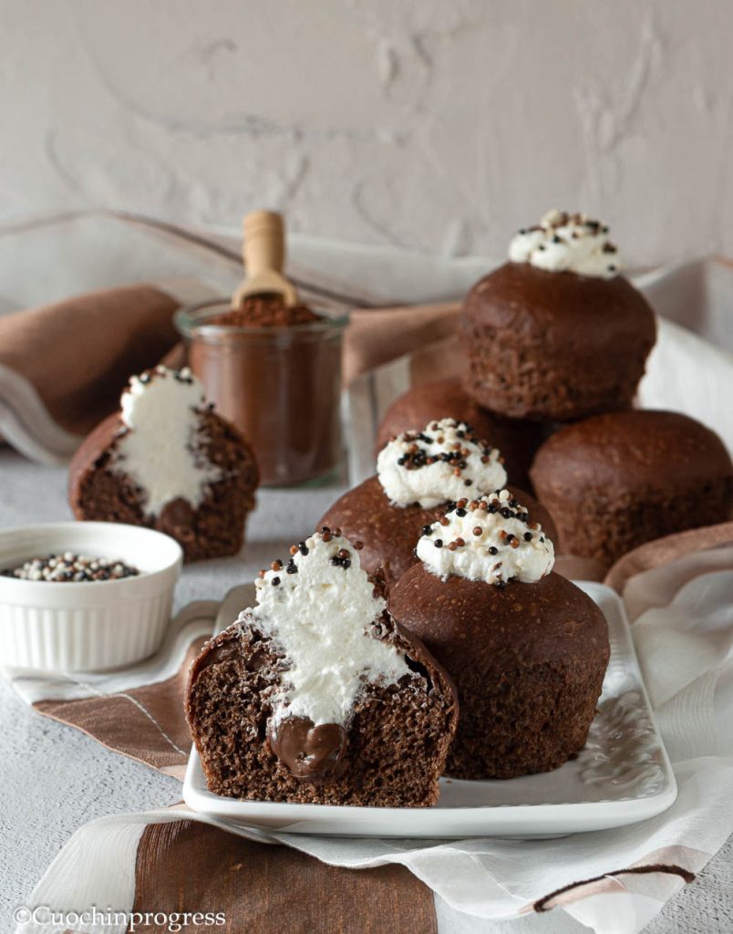 DIE MUFFIN-BRIOCHE MIT SCHOKOLADE sind kleine Meisterwerke fürs Frühstück oder als Snack. Fluffig und mit einem cremigen Kern, der im Mund zergeht: Diese Brioche sind ein kleines süßes Meisterwerk, perfekt, um den Tag richtig zu beginnen… und mit einem Lächeln auf den Lippen.