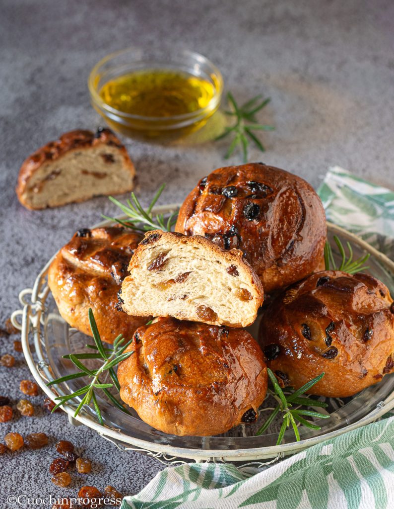 Sobald dein Pan di Ramerino fertig gebacken ist, aus dem Ofen nehmen und, wenn es lauwarm ist, mit einem Sirup bestreichen, der entsteht, indem du Wasser und Zucker 2 Minuten kochen lässt. So werden die Brötchen schön glänzend.