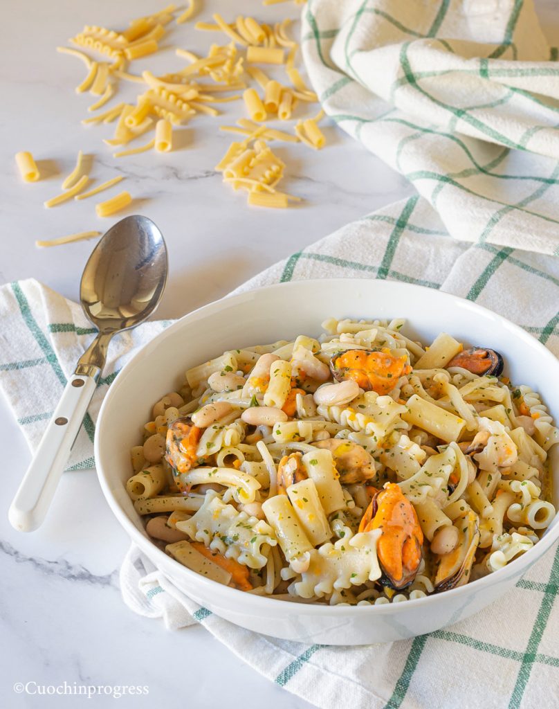 Der Reiz dieses Rezepts entsteht aus dem Zusammenspiel der salzigen, meerigen Note der Miesmuscheln und der Cremigkeit sowie Zartheit der Cannellini-Bohnen, verfeinert durch ein großzügiges Anschwitzen und eine gute Prise Pfeffer sowie Petersilie. Was die Pasta betrifft, gibt es verschiedene Richtungen: einige verwenden Tubettini, Cavatelli oder Fusilli; ich habe mich für gemischte Pasta entschieden, die ärmste, aber auch traditionellste Variante. Noch ein kleiner Hinweis: Das Gericht ist keine Suppe, aber auch keine trockene Pasta – halten Sie die Sauce schön sämig und cremig, dann ist der Erfolg garantiert!