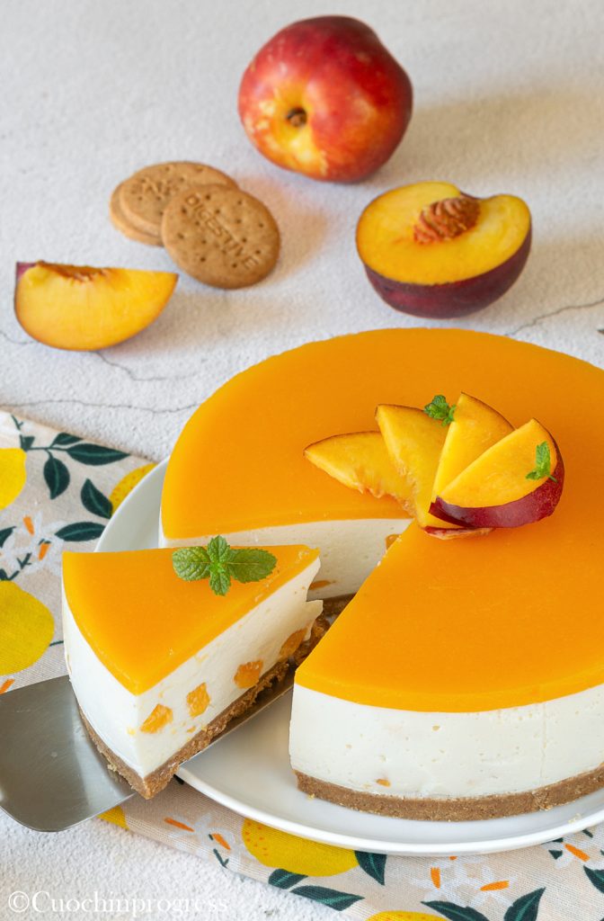 Nach der Ruhezeit stürzen Sie den Pfirsich-Cheesecake und dekorieren ihn mit einigen Pfirsichscheiben und frischen Minzblättern.