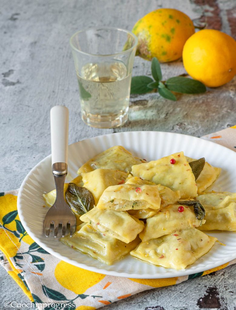Gebt Zitronenschale, die aufgebrochenen rosa Pfefferkörner, eine Prise Salz und etwas Kochwasser der Ravioli dazu. Schwenkt die Pfanne, um eine Emulsion und eine dickliche, leicht weiße Sauce zu erhalten.