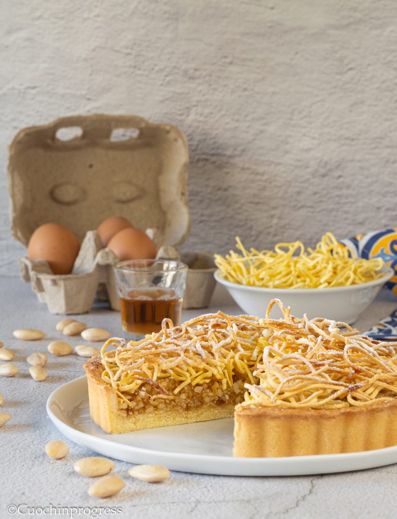 Die TAGLIATELLEN-TORTE oder RICCIOLINA-TORTE ist ein Gebäck der emilianischen Tradition, besonders aus Ferrara. Einfach zuzubereiten und sehr lecker: Sie besteht aus einem Mürbeteigboden, der eine weiche Mandelfüllung umschließt, aromatisiert mit Amaretto-Likör (noch besser wäre ein Likör mit bitteren Mandeln), und alles ist bedeckt von einem Nest aus Tagliatelle oder besser Tagliolini. Süße, Knusprigkeit, Aromen: Eine wahre Sinfonie für den Gaumen.