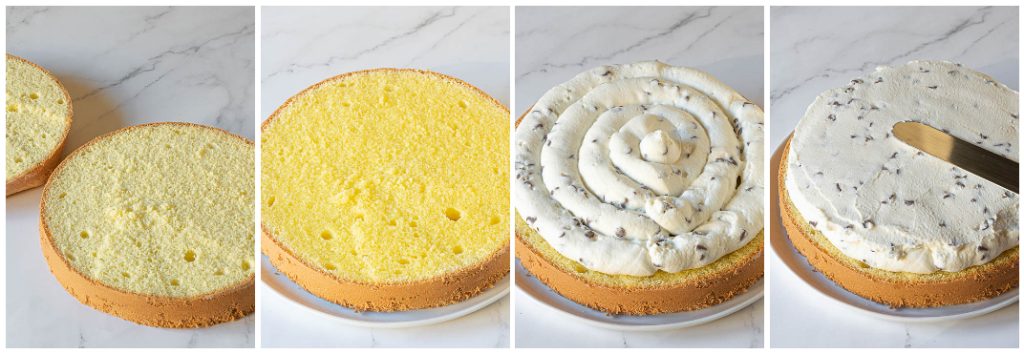 • Schneide den Biskuitboden waagerecht in zwei Hälften, tränke die erste Scheibe großzügig mit der Hälfte der Tränke und verteile eine dicke Schicht Ricotta-Creme darauf.