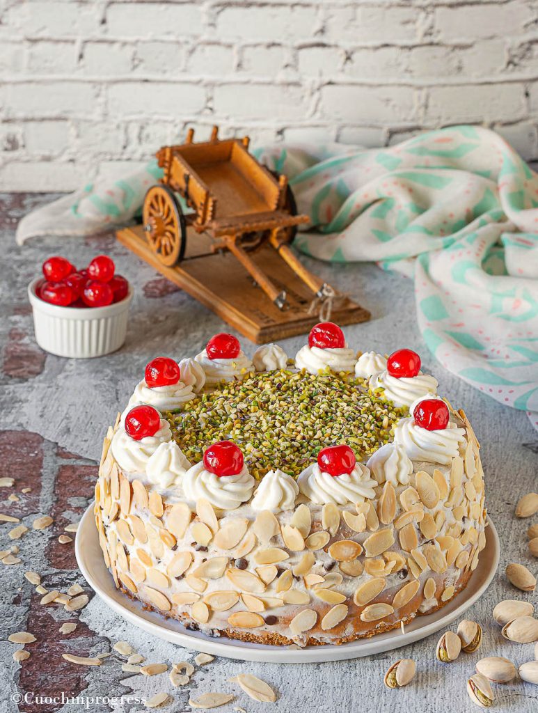 Auch die Dekoration hat ihre Bedeutung. Neben der ohnehin wichtigen Optik geben Mandelblättchen und gehackte Pistazien das bisschen Knusprigkeit, das das Kauen angenehm macht. Und schließlich – der Tradition entsprechend – dürfen auch die kandierten Kirschen nicht fehlen…