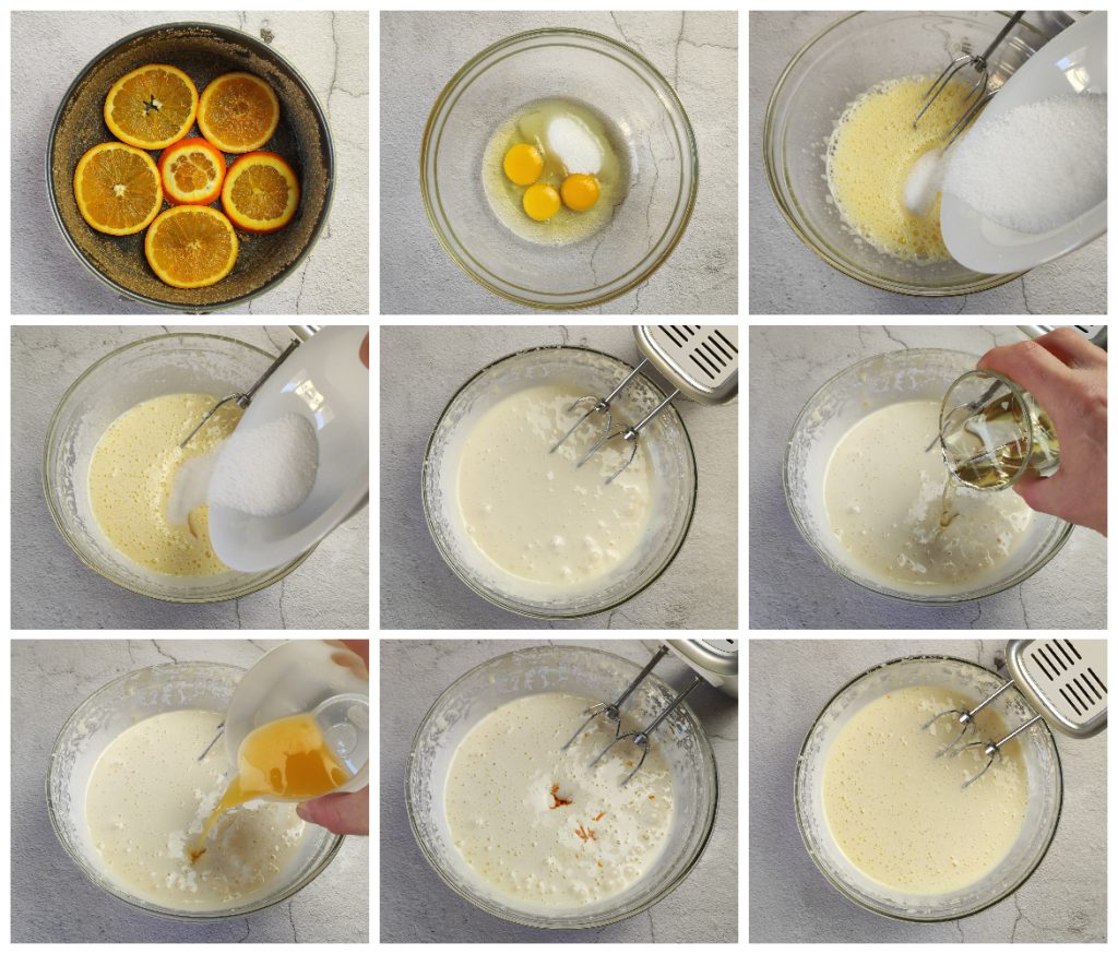 Den Teig in die Form gießen, die Oberfläche glatt streichen und den umgedrehten Orangenkuchen in einem vorgeheizten, statischen Ofen bei 180° für 45–50 Minuten backen.