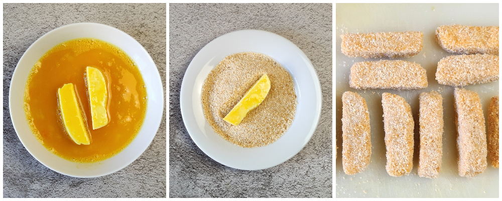 Sie lassen sich auch gut im Voraus zubereiten: Auf ein Tablett legen, einfrieren und anschließend in einen Gefrierbeutel umfüllen. Bei Bedarf können Sie die Sticks gefroren frittieren oder im Ofen backen.