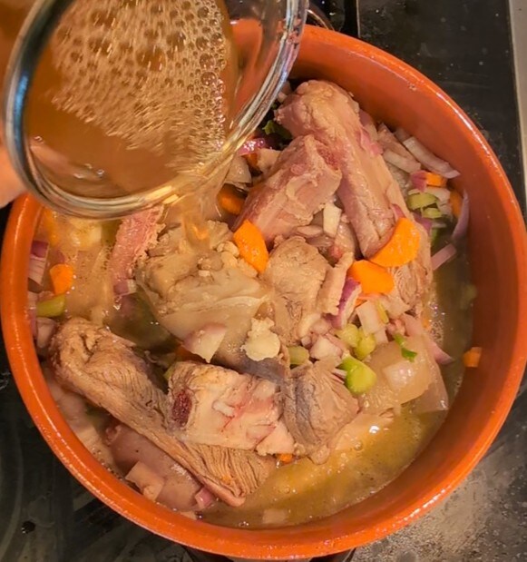 Anschließend geben wir das Gemüse-Soffritto zusammen mit dem gesamten Fleisch hinzu: die Rippchen, die Würstchen, den Fuß und die Schwarte. Wir braten alles einige Minuten zusammen an, bevor wir den Weißwein zum Ablöschen hinzufügen.