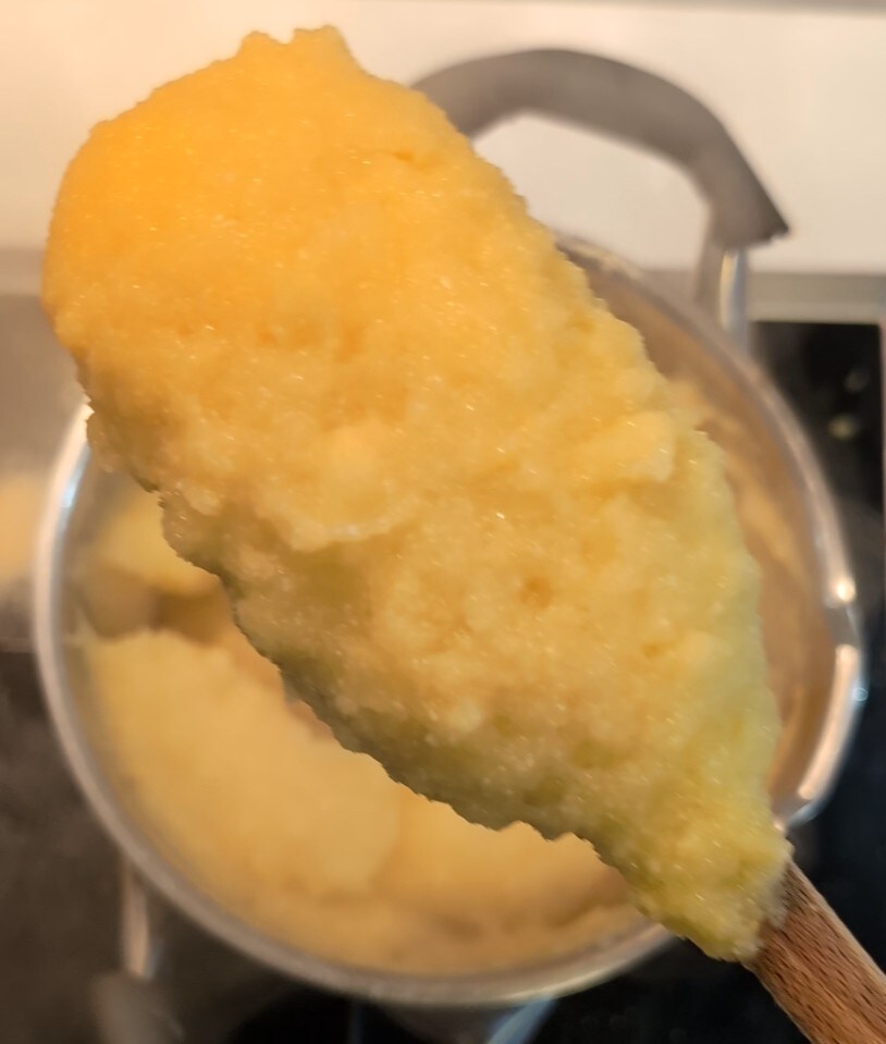 Zum Abschluss, während wir auf das Ende der Cassoeula-Kochzeit warten, beginnen wir, in den letzten 20 Minuten die Polenta zu kochen, so dass sie heiß und dampfend zusammen mit dem Rest serviert wird.
