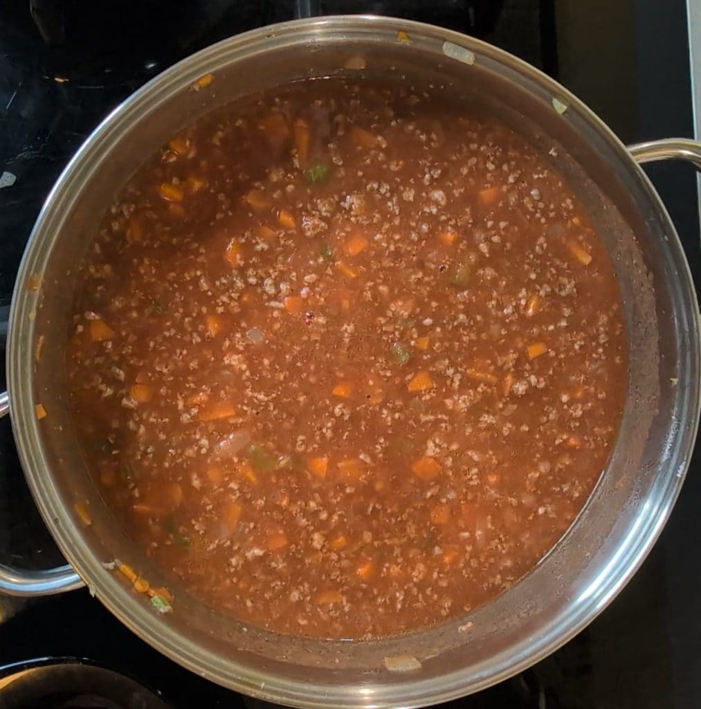 Nun fügen wir das Hackfleisch von Schwein und Rind hinzu. Erhöhen wir die Hitze leicht und braten das Fleisch an, häufig umrühren, um zu verhindern, dass es am Topfboden kleben bleibt und gleichmäßig gart. Wenn das Fleisch gut angebraten ist, ist es Zeit, mit dem Wein abzulöschen!